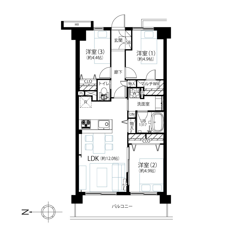 洋室 4.9畳  洋室 4.9畳  洋室 4.4畳  L 12畳